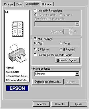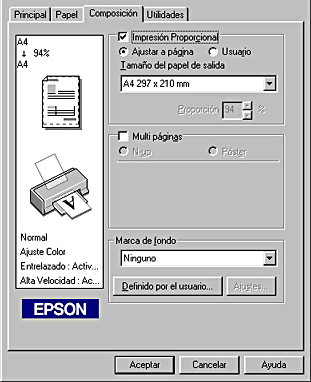 El menú Composición permite ajustar la Impresión proporcional, Multi páginas y Marca de fondo. Consulte la sección correspondiente más abajo.