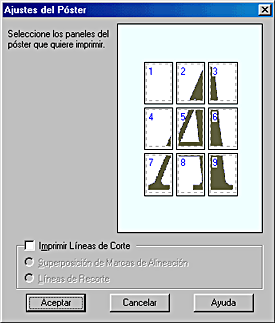 Si sólo desea imprimir algunos de los paneles y no imprimir todo el póster, haga clic en los paneles que no desee imprimir y después en Aceptar para cerrar el cuadro de diálogo Ajustes del póster.
