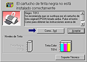 Si queda poca tinta o se agota, aparecerá el botón Cómo a continuación del cuadro de texto. Si hace clic en Cómo, EPSON Status Monitor 3 le ayudará paso a paso en el procedimiento de sustitución del cartucho.
