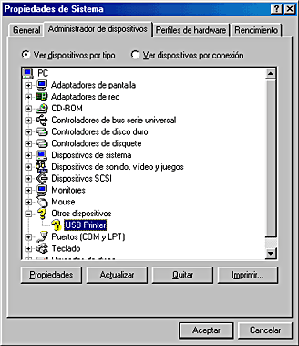 Si, debajo de Otros dispositivos, no aparece niImpresora USB, ni EPSON Stylus C40 Series ni EPSON Stylus C20 Series, haga clic en Actualizar o desenchufe el cable USB de la impresora y luego vuelva a enchufarlo. Cuando haya confirmado la aparición de dichos dispositivos, vaya al paso 5.
