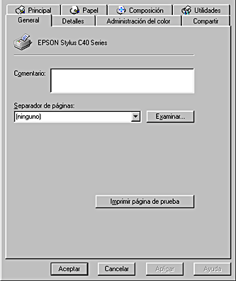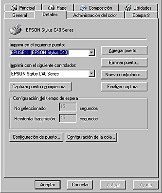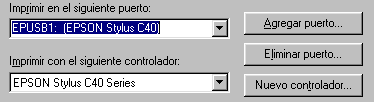 Si EPUSBx: (EPSON Stylus C40 Series o EPSON Stylus C20 Series) aparece en el cuadro de lista Imprimir en el puerto siguiente, significa que el controlador de dispositivo de impresora USB y el software dela impresora están correctamente instalados. Si no aparece el puerto correcto, vaya al paso siguiente.