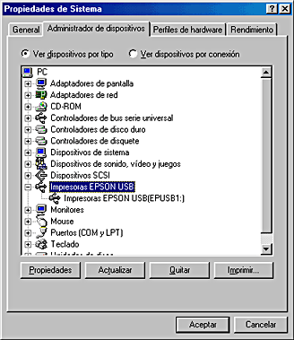 Si sus controladores están instalados correctamente, aparecerá Impresoras EPSON USB en el menú Administrador de dispositivos.
