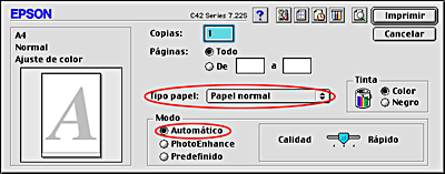 Seleccione Papel normal como ajuste de Tipo papel y Automático como ajuste de Modo.