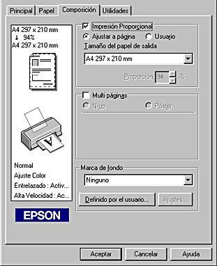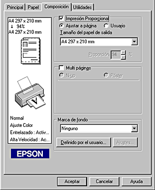 Seleccione el tamaño del papel cargado en la impresora en Tamaño del papel de salida del menú Composición (Windows) o al cuadro de diálogo Ajustar página (Macintosh).