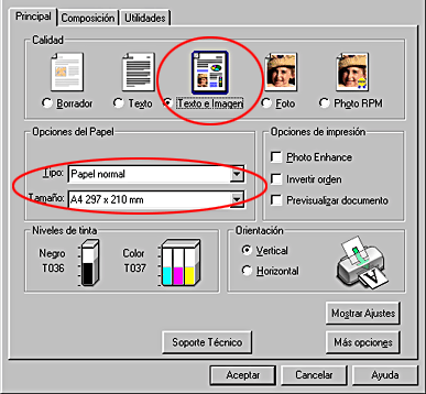 Haga clic en la ficha Principal y luego seleccione Papel normal y A4 como ajuste de Opciones del Papel y Texto e Imagen como ajuste de Calidad.