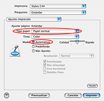 Seleccione Papel normal en Tipo papel, y Automático en Modo.