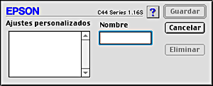 Escriba un nombre exclusivo (de 16 caracteres como máximo) para sus ajustes en el cuadro de texto Nombre y haga clic en Guardar. Los ajustes se añadirán a la lista Ajustes personales. Puede guardar hasta 100 ajustes personalizados distintos.
