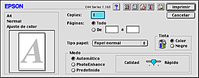 En el cuadro de diálogo Imprimir, puede configurar los ajustes de Tipo papel, Modo, Tinta, Copias y Páginas. Desde este cuadro de diálogo también puede acceder a otros cuadros de diálogo, en los que podrá ajustar el tiempo de impresión, previsualizar el documento antes de imprimirlo y guardar los datos de spool en un archivo. Consulte la sección correspondiente más abajo.