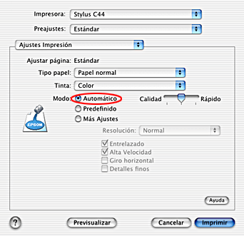 Si está seleccionado el modo Automático con Ajustes Impresión, el software de la impresora se ocupará de los ajustes detallados acordes a los ajustes de Tipo papel y Color actuales.