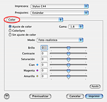 Si selecciona Color en el menú emergente, podrá controlar los métodos de correspondencia y ajuste del color suministrados con el controlador de la impresora. Siga estas instrucciones.