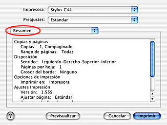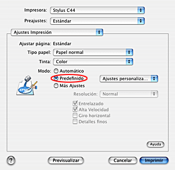 Al seleccionar un ajuste predefinido, automáticamente se definen otros ajustes tales como Resolución y Color. Las modificaciones de estos ajustes aparecen en la parte izquierda del cuadro de diálogo Imprimir.