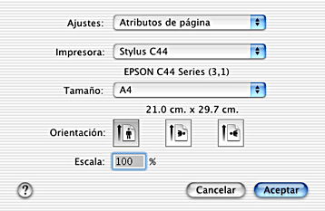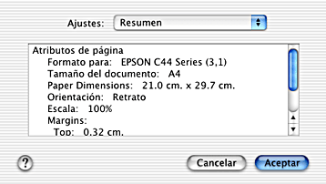 En la lista, figuran los ajustes en vigor de Formato para (Impresora), Tamaño del documento, Dimensiones del papel, Orientación, Escala y Márgenes.