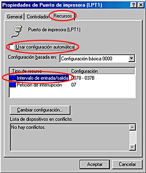 ![]() | Haga clic en la ficha Recursos y desactive la casilla de verificación Usar configuración automática. Escriba los ajustes del Intervalo de entrada/salida mostrado en el cuadro de configuración de recursos. |