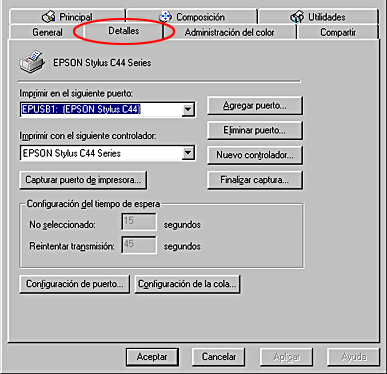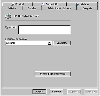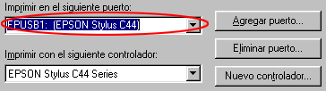 Si EPUSBx: (EPSON Stylus C44) aparece bajo Imprimir en el siguiente puerto, significa que el controlador de dispositivo de impresora USB y el software de la impresora están correctamente instalados. Si no aparece el puerto correcto, vaya al paso siguiente.