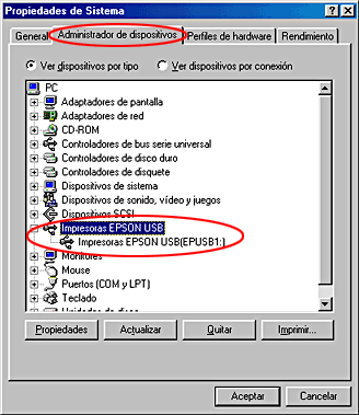 Si sus controladores están instalados correctamente, aparecerá Impresoras EPSON USB en el menú Administrador de dispositivos.