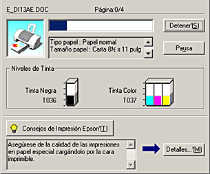 EPSON Spool Manager es parecido al Administrador de impresión de Windows. Si recibe dos o más trabajos de impresión al mismo tiempo, los retiene en el orden de recepción. (Si las impresoras están en una red, esto se conoce como "cola de impresión".) Cuando un trabajo de impresión llega al principio de la cola, EPSON Spool Manager lo envía a la impresora. Puede cancelar trabajos de impresión desde Spool Manager. También puede ver información sobre el estado de la impresión de los trabajos enviados a la impresora, así como hacer una pausa, reanudar o reiniciar los trabajos de impresión seleccionados.