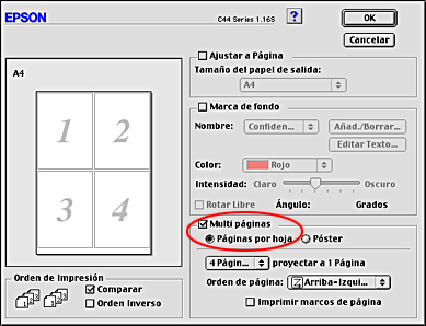 Configure los siguientes ajustes en impresión de Páginas por hoja.