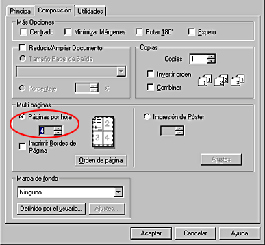Seleccione el ajuste Páginas por hoja de Multi páginas en el menú Composición.