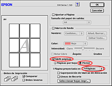 Seleccione la opción Impresión de Póster de Multi páginas en el menú Composición. Después, haga clic en la flecha hacia arriba o hacia abajo para seleccionar 2x2, 3x3 ó 4x4.