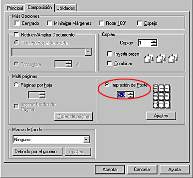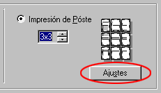 Para ajustar la forma en que va a imprimir el póster, haga clic en Ajustes. Se abrirá el cuadro de diálogo Ajustes del Póster.