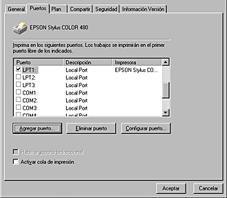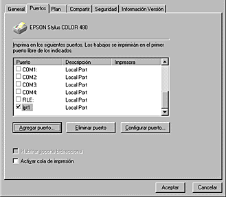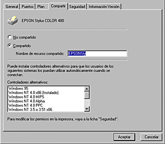 En esta sección, se explica cómo configurar su impresora para que puedan utilizarla el resto de los ordenadores de la red. Cuando se usa EPSON Stylus COLOR 480 como impresora compartida, sólo se pueden realizar operaciones tales como cambiar cartuchos de tinta y retirar el papel atascado en el ordenador conectado directamente a la impresora. Los ordenadores conectados a la impresora a través de una red se ven limitados a determinadas operaciones.