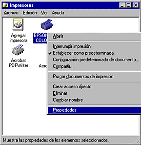 Haga doble clic en el icono Impresoras del Panel de Control, haga clic (con el botón secundario del ratón) en el icono de su impresora y luego haga clic en Propiedades a partir de la lista de opciones.