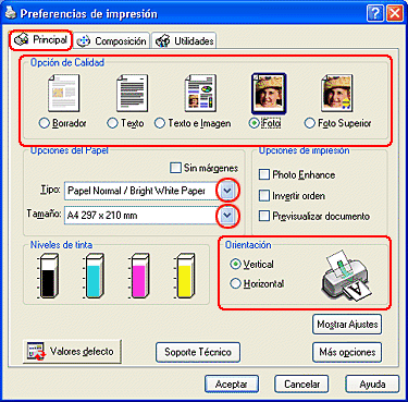 Configure los ajustes de Tamaño papel y Orientación adecuados.