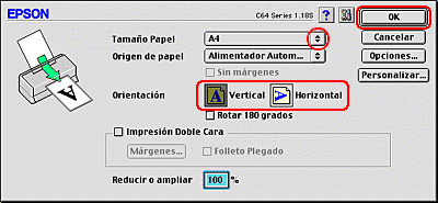 Configure el ajuste de Impresora deseado. Cuando imprima con márgenes estándar, seleccione Stylus C64.
