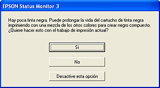 El siguiente cuadro de diálogo aparece cuando queda poca tinta negra y se cumplen los siguientes requisitos: