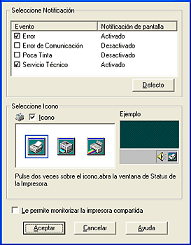 Haga clic en este botón para abrir el cuadro de diálogo Preferencias de monitorización, que permite ajustar EPSON Status Monitor 3.