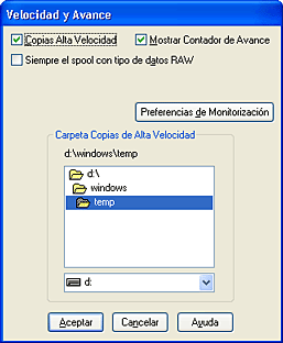 Si desea imprimir varias copias de su documento más rápidamente, seleccione Copias alta velocidad. La velocidad de impresión aumenta utilizando el espacio del disco duro como memoria caché al imprimir varias copias del documento.