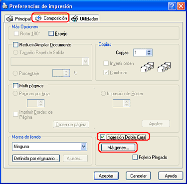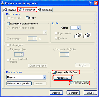 Haga clic en la ficha Composición y seleccione la casilla de verificación Impresión doble cara.