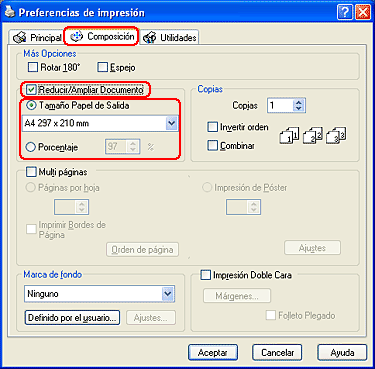 Haga clic en la ficha Composición y seleccione la casilla de verificación Reducir/Ampliar documento. Puede seleccionar los siguientes ajustes para cambiar el tamaño del documento.