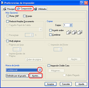 ![]() | Haga clic en la ficha Composición, elija la marca de fondo deseada en la lista Marca de fondo y haga clic en Ajustes. |