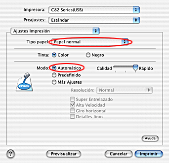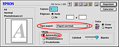 Seleccione Papel normal en Tipo papel, y Automático en Modo.