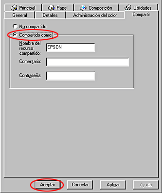 Seleccione Compartida como, escriba los datos exigidos sobre la impresora y haga clic en Aceptar.