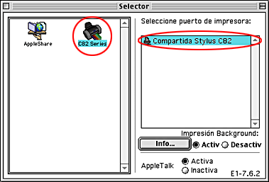 Haga clic en OK. En la lista de puertos del Selector, ahora figura el nombre de la impresora compartida.