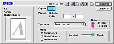 Según el soporte seleccionado en la lista Tipo papel (mientras está seleccionado Automático), aparecerá un control deslizante a la derecha de las opciones de Modo que le permite elegir entre Calidad, Rápido y el nivel intermedio. Siempre que la calidad de la impresión sea más importante que la velocidad, seleccione Calidad.