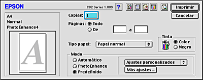 En el cuadro de diálogo Imprimir, puede configurar los ajustes de Tipo papel, Modo, Tinta, Copias y Páginas. Desde este cuadro de diálogo también puede acceder a otros cuadros de diálogo, en los que podrá ajustar el tiempo de impresión, previsualizar el documento antes de imprimirlo y guardar los datos de spool en un archivo. Consulte la sección correspondiente más abajo.