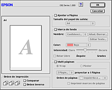 El cuadro de diálogo Composición le permite adaptar, automáticamente, el documento al tamaño del papel, imprimir dos o cuatro páginas en una sola hoja de papel, imprimir imágenes de tamaño póster ampliando una página para que ocupe varias hojas, colocar marcas de fondo en documentos y especificar el orden de impresión de sus trabajos. Consulte la sección correspondiente más abajo.