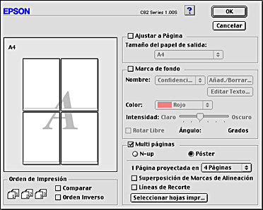 Si está seleccionada la casilla de verificación Multi páginas, puede elegir entre dos ajustes: N-up y Póster. Consulte la sección correspondiente más abajo.