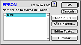 ![]() | Si desea utilizar un archivo de imagen como marca de fondo, haga clic en Añadir PICT. Elija el archivo de imagen deseado y haga clic en Abrir. |