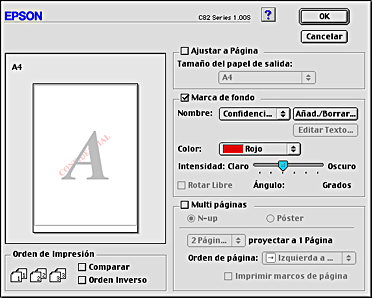 Seleccione la marca de fondo que desee imprimir en la lista Nombre y especifique su posición, tamaño, color e intensidad. Si desea modificar la posición y el tamaño de la marca de fondo, arrástrela con el ratón en la ventana de previsualización de la izquierda.