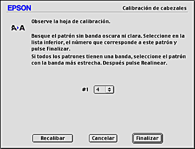 Busque un patrón que no contenga ninguna banda negra o blanca. Después, busque el número del patrón correspondiente en el cuadro de lista desplegable del cuadro de diálogo Calibración de cabezales. Haga clic en Siguiente. Entrarán en vigor los nuevos ajustes.