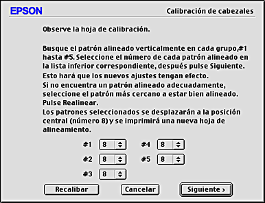 En cada uno de los patrones de la hoja de prueba impresa, elija la línea vertical que esté mejor alineada. En cada patrón, seleccione el número de línea correspondiente en el cuadro de lista desplegable del cuadro de diálogo Calibración de cabezales y haga clic en Siguiente. Entrarán en vigor los nuevos ajustes.