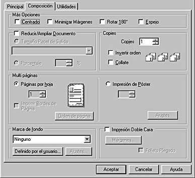 Seleccione la opción Páginas por hoja (bajo Multi páginas en el menú Composición) si desea imprimir 2 ó 4 páginas de su documento en una sola hoja de papel.