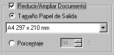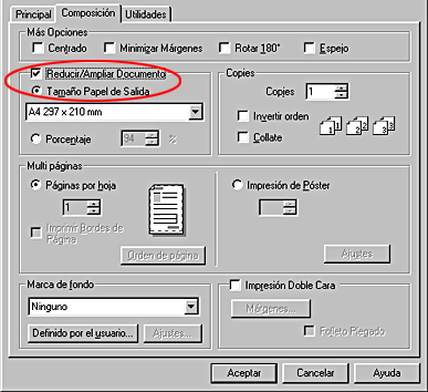 En el menú Composición (en Windows), seleccione la casilla de verificación Reducir/Ampliar Documento y la opción Tamaño Papel de Salida.