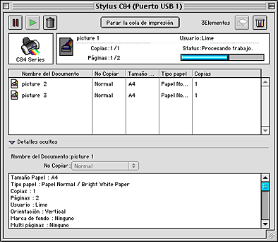 Después de enviar a la impresora un trabajo de impresión, puede emplear la utilidad EPSON MonitorIV para comprobar, cancelar o cambiar la prioridad de los trabajos que se encuentran en la cola de impresión. Esta utilidad también muestra el estado del trabajo que se esté imprimiendo en ese momento.