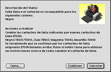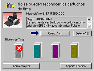 Si queda poca tinta o se agota, aparecerá el botón Cómo a continuación del cuadro de texto. Si hace clic en Cómo, EPSON Status Monitor 3 le ayudará paso a paso en el procedimiento de sustitución del cartucho.