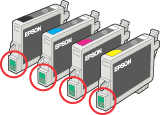 Pulse el botón de la tinta . El cabezal de impresión se desplazará a la posición de revisión de los cartuchos de tinta, y el indicador de alimentación empezará a parpadear. El cartucho de tinta señalado con la marca está vacío o casi vacío.
